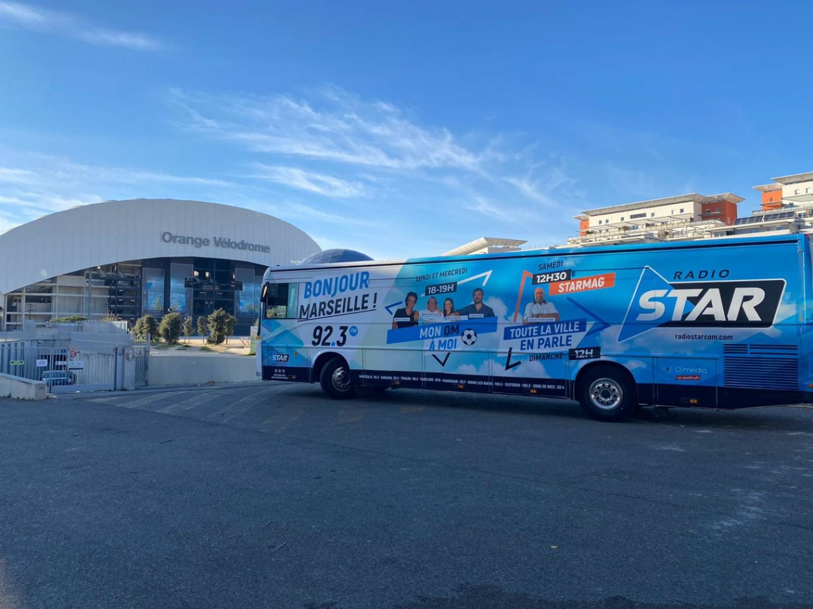 Le bus Radio Star stationné devant le Vélodrome pour un max de visibilité