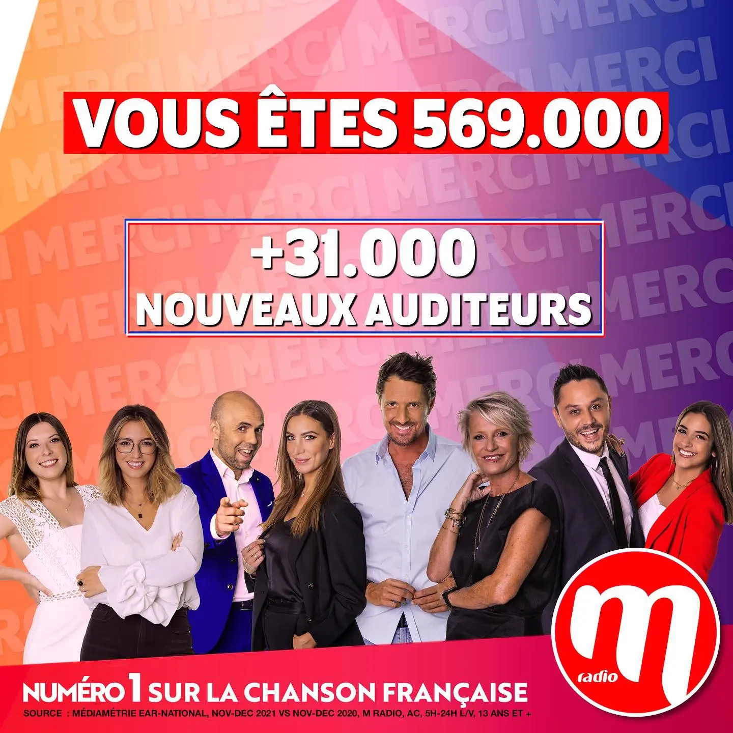 Les audiences intermédiaires de janvier sont tombées et bonne nouvelle : la radio se porte mieux ! Parmi les bons élèves, notre radio partenaire, M Radio, attire toujours plus d’auditeurs. Les animateurs et la programmation de la radio numéro 1 sur la chanson française a conquis le cœur de 31 000 auditeurs supplémentaires en une année. Preuve que l'on écoute toujours la radio et que le développement du DAB+ commence à fonctionner.