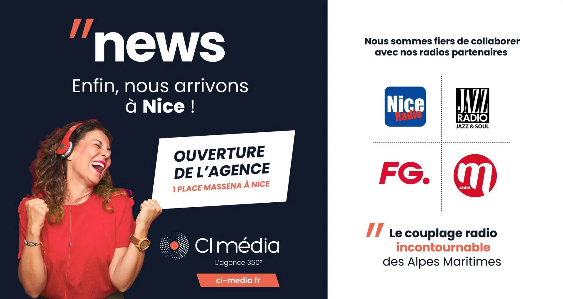 Pour une offre toujours plus large, les équipes de CI Média débarquent enfin sur Nice et sa région. Pour mettre en lumière votre marque ou votre événement via un média puissant et réactif, CI Média propose avec un couplage radios incontournable dans les Alpes Maritimes mais pas que…