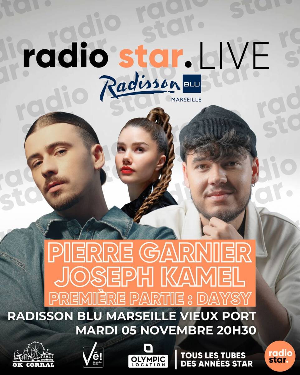 Décidément, notre radio partenaire Radio Star Sud se fait remarquer en ce début de saison. Après deux show exceptionnels, voici un nouveau Radio Star Live programmé le mardi 5 novembre au Radisson Blu Marseille Vieux Port ! Une soirée qui s’annonce inoubliable avec Pierre Garnier, Joseph Kamel et Daysy.